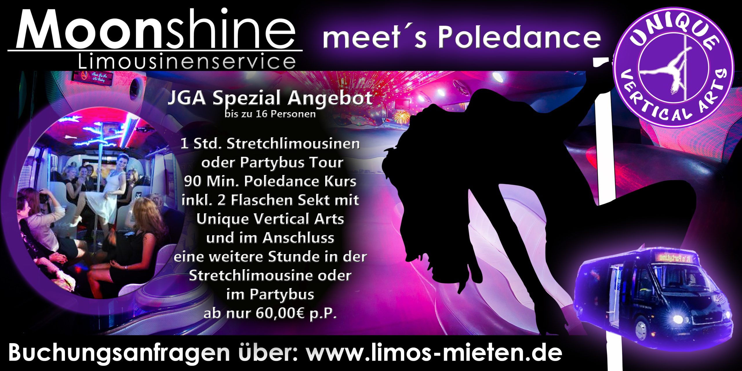 Mit dem Stretchlimousine/ Partybus – Poledance Kurs macht Ihr euren Junggesellingenabschied zum Highlight – ein Rundumpaket mit allem was dazu gehört.